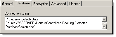 Type Provider=vfpoledb;Data Source="\\XXXXX\Harms\Centralized Booking Biometric Database\salon.dbc" in the Connection String field, where "XXXXX" is the name of the server you noted in Step 2.