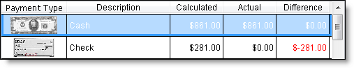The amount of cash that you counted displays in the Actual field, with the variance between the calculated cash total and actual cash total displayed in the Difference field. If the variance is unacceptable, recount the cash and adjust the actual total as necessary.