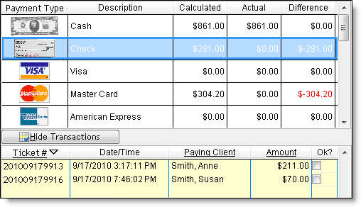 Note: If a negative amount displays in bold text, you need to award the tip to the service provider(s). To correct this issue, select the transaction, click Classify Tip(s), enter the tip to award to the service provider(s), and click Ok.