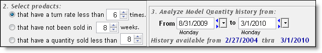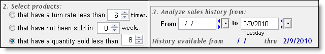that have a turn rate less then _ times = Select this option and select the turn rate below which products are classed as slow moving. Select a date range in which to analyze turn rates in the From and To fields.