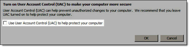 Deselect Use User Account Control (UAC) to help protect your computer.