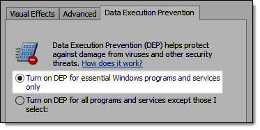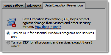 Select Turn on DEP for essential Windows programs and services only.