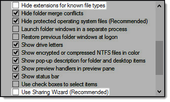 Scroll down the list and deselect the Hide extensions for known file types and Use Sharing Wizard options.