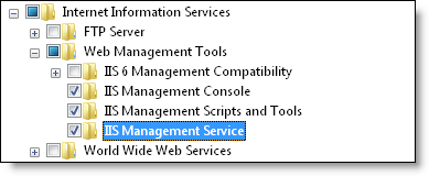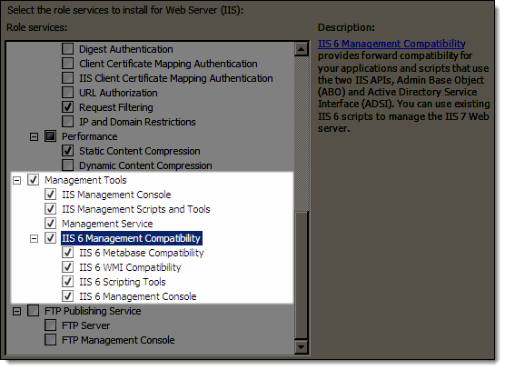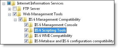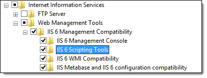 Double-click Internet Information Services, double-click Web Management Tools, double-click IIS 6 Management Compatibility, and select the following: