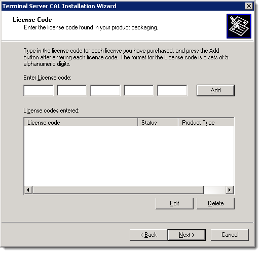 Complete the following for each Terminal Services client access license (TS CAL) that you purchased: