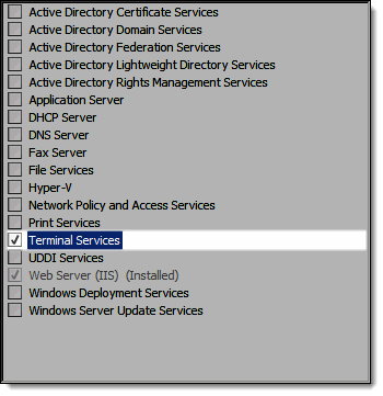 The first step is to install the Terminal Server component (Windows Server 2003) or the Terminal Server role service (Windows Server 2008).